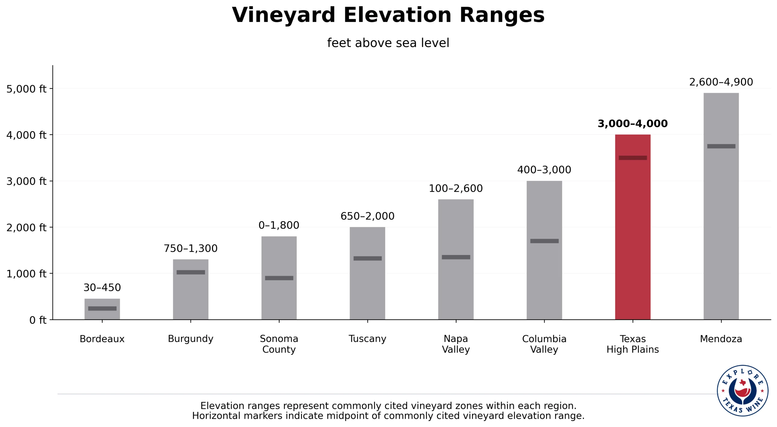Bordeaux rises only a few hundred feet above sea level. Burgundy’s slopes rarely exceed 1,300 feet. Even Napa Valley, framed by mountains, grows most of its vineyards below 2,600 feet. Sonoma, Tuscany, and Washington’s Columbia Valley all sit largely below the elevation of the Texas High Plains.